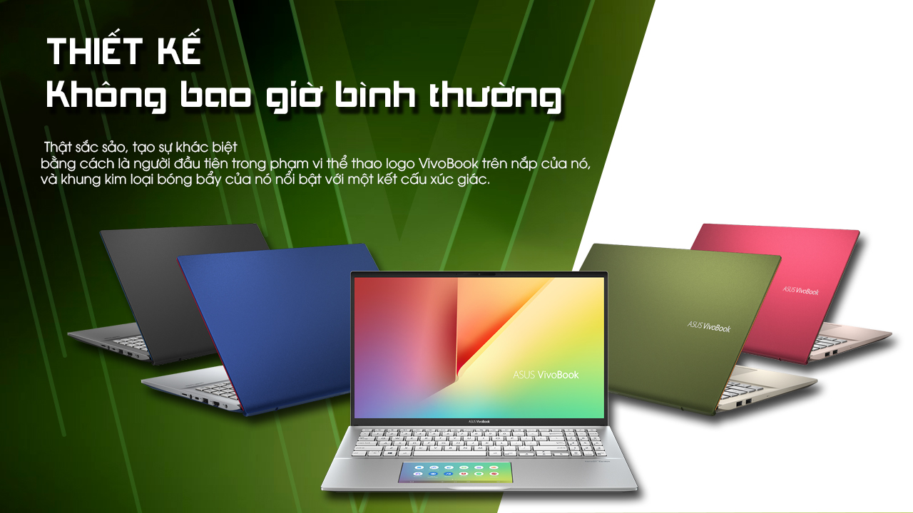 Về thiết kế, phiên bản Asus Vivobook S14/S15 lần này cũng không quá khác biệt so với những dòng ultrabook Asus Vivobook S trước. Thật đúng khi gọi đây là dòng Laptop đa màu sắc khi sở hữu đến 5 gam màu nổi bật: Moss Green, Punk Pink, Cobalt Blue, Transparent Sliver và Gun Metal. Máy vẫn được thiết kế với khung nhôm kim loại chắc chắn, bóng bẩy, tạo nên một cảm giác sang trọng cho những ai sở hữu chiếc máy này. Các điểm nhấn về màu sắc ở cạnh bên mang đến một cái nhìn thanh mảnh, gọn nhẹ và là lựa chọn lý tưởng cho những tín đồ yêu công nghệ và thích sự linh động trong di chuyển.