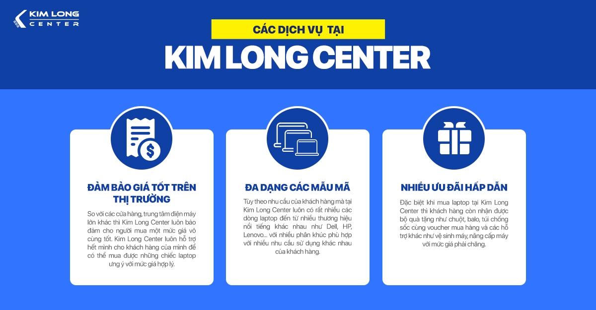 Cùng với sự uy tín và tên tuổi của mình trên thị trường, cửa hàng laptop Kim Long Center luôn tự hào là một trong những địa chỉ cung cấp laptop uy tín trong thành phố với đa dạng các mẫu mã laptop và chính sách bảo hành, đảm bảo cao cho khách hàng khi đến mua. Nếu như bạn đang tìm một nơi bán laptop uy tín với mức giá ổn định thì Kim Long Center chính là một lựa chọn mà bạn nhất định phải ghé qua.