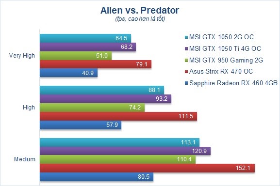 - Nếu so với mẫu card Sapphire Nitro RX 460 OC và Asus Strix RX 470 mình thử nghiệm gần đây thì GTX 1050 và 1050 Ti có mức tiêu thụ năng lượng thấp hơn khoảng 20W. Điều này cũng phần nào thể hiện ưu thế của kiến trúc đồ họa Pascal được phát triển nhằm cải thiện mức tiêu thụ điện năng trong khi vẫn đạt được hiệu suất như mong muốn.