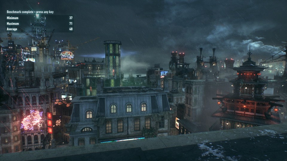 Trong khi đó Batman: Arkham Knight, dù sử dụng engine đồ họa Unreal 3 cũ kĩ nhưng vẫn là tựa game có chất lượng đồ họa đẹp và không hề thua kém những tựa game mới khác. Cấu hình thử nghiệm đạt trung bình 66 fps và giảm còn 48 fps với chất lượng đồ họa ở mức High.